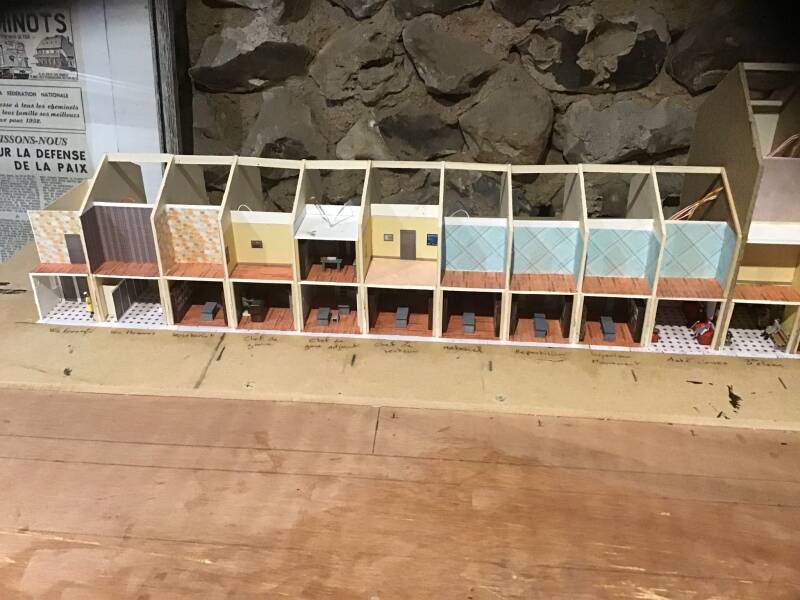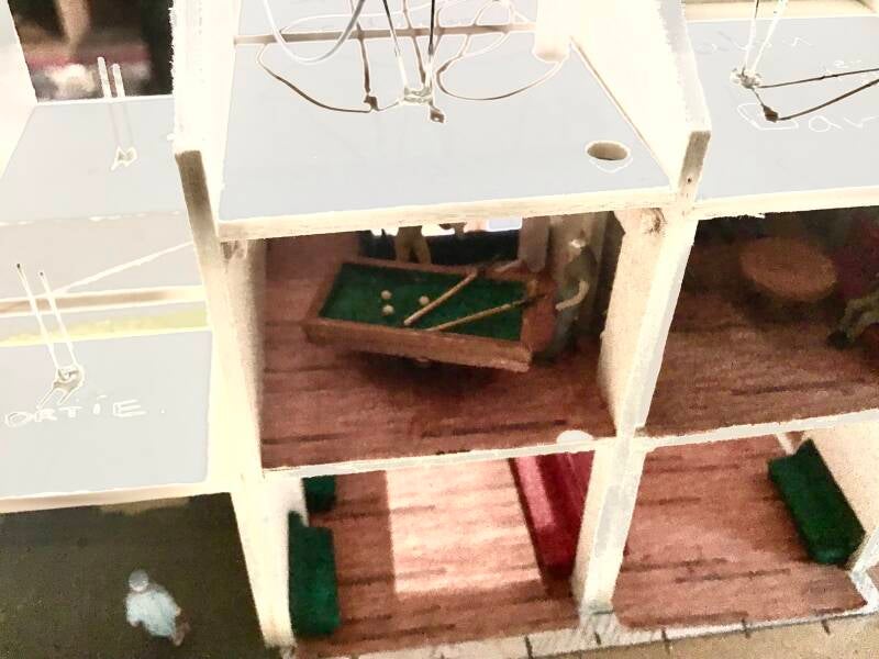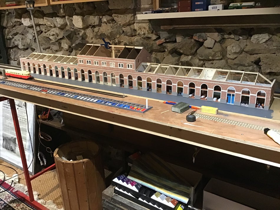 Le Bâtiment voyageurs d’Évreux Du style Ouest, il est le plus long bâtiment voyageurs construit de cette architecture. Implanté en 1888 après le forage des tunnels de Netreville et de la Justice en 1886, afin de remplacer l’ancienne gare plus petite située plus haut à l’entrée de la Madeleine. Celle-ci malheureusement ne permettant pas de construire un faisceau de voies suffisant pour le trafic marchandises d’une préfecture, il a donc été décidé de construire un nouveau bâtiment plus grand en contrebas en créant une plaine qui recevra un faisceau de voies optimal. L’ancienne gare quand à elle sera transformée en bâtiment administratif de la compagnie. Le 9 juin1940 les bombardements allemands détruise en grande partie se nouveau bâtiment, et la libération en fait tout autant !!! La façade de la gare est détruite, la gare coupée en deux et la marquise qui couvrait la voie 1 et 2 est entièrement détruite. Le style de la façade est d’ailleurs reconstruit dans un style plus simple. Quand à la marquise elle ne sera pas reconstruite. Après la guerre un souterrain est construit pour faciliter le passage des voyageurs sur les différents quais. Nous avons choisi la période 1965 1975 pour notre réalisation ! A l’échelle le bâtiment mesure 1m37 de long, et particularité qui rend cette gare singulière les deux ailes de part et d’autre du bloc centrale ne possède pas le même nombres d’arches 10 d’un côté 11 de l’autre. Ne cherchez pas à savoir pourquoi ? Les quais feront plus de trois mètre pour respecter l’échelle !!! Vous remarquerez que l’intérieur de la gare est animé, les bagages, le hall, les guichets, la buvette, la consigne, les différents bureaux comme celui du chef de gare et les toilettes. Le tout éclairé bien sûr !! Sur les photos vous remarquerez que le chantier n est pas terminé ! Cela a demandé un gros travail déjà et cela avance à son rythme, mais le bout du tunnel approche après deux ans depuis le début du chantier !! Mais nous pensons que le jeu en vaut la chandelle et que le rendu sera au rendez-vous